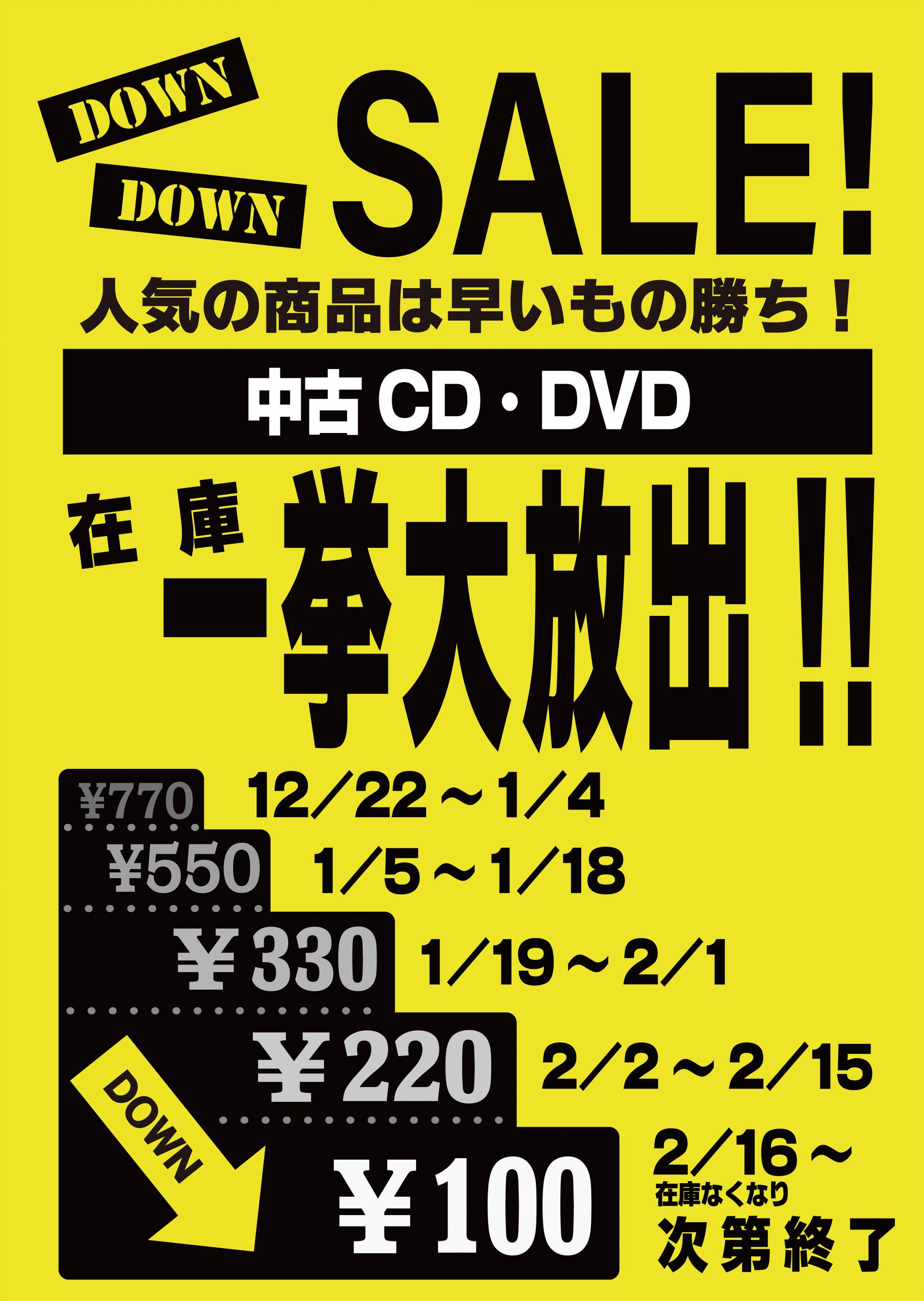 DOWN DOWNセールのご案内 お知らせ 2026.01.05 本日よりDOWN DOWNセール1ランクダウン まだある今のうちに買うか、下がるまで待つか‼ 金木タウンセンター店及び、鶴田フッドリバーモール店のみの開催となります。